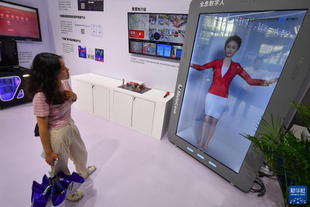 7月12日,參觀(guān)者在中國新媒體技術(shù)展上參觀(guān)全息數字人。