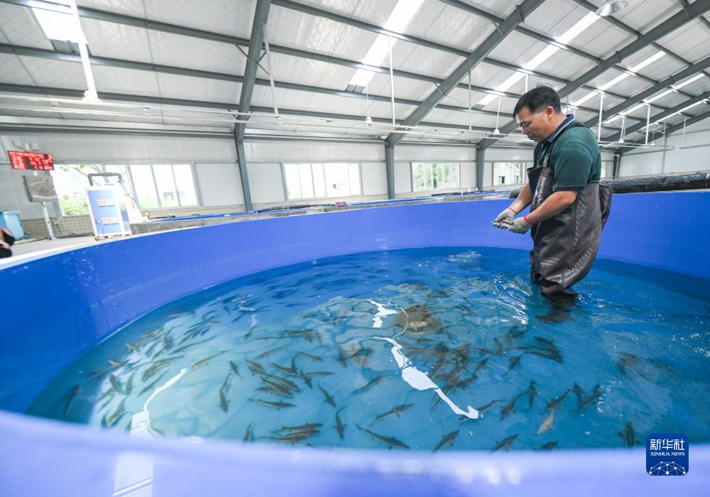 2023年6月27日,在宜賓珍稀水生動(dòng)物研究所與四川省農科院水產(chǎn)研究所合作的繁育基地,周亮查看長(cháng)江鱘幼魚(yú)的生長(cháng)情況。新華社記者 王曦 攝