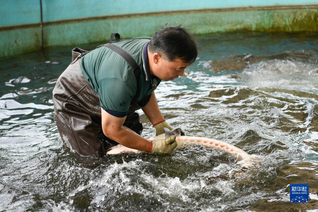 2023年6月27日,在宜賓珍稀水生動(dòng)物研究所與四川省農科院水產(chǎn)研究所合作的繁育基地,周亮檢查不久前進(jìn)行人工繁殖的長(cháng)江鱘身體恢復情況。新華社記者 胥冰潔 攝