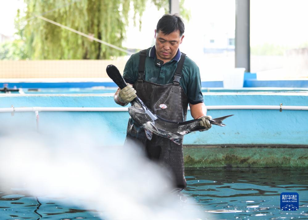 2023年6月27日,在宜賓珍稀水生動(dòng)物研究所與四川省農科院水產(chǎn)研究所合作的繁育基地,周亮在查看鴨嘴鱘的生長(cháng)情況。新華社記者 王曦 攝