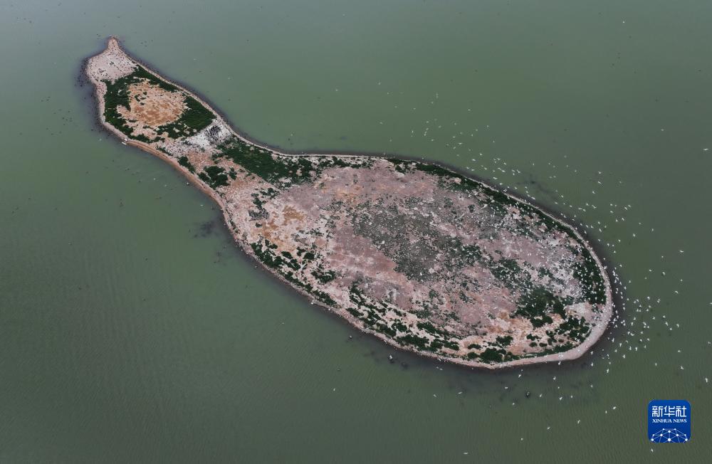 7月11日,大批候鳥(niǎo)在康巴諾爾國家濕地公園湖心島覓食(無(wú)人機照片)。