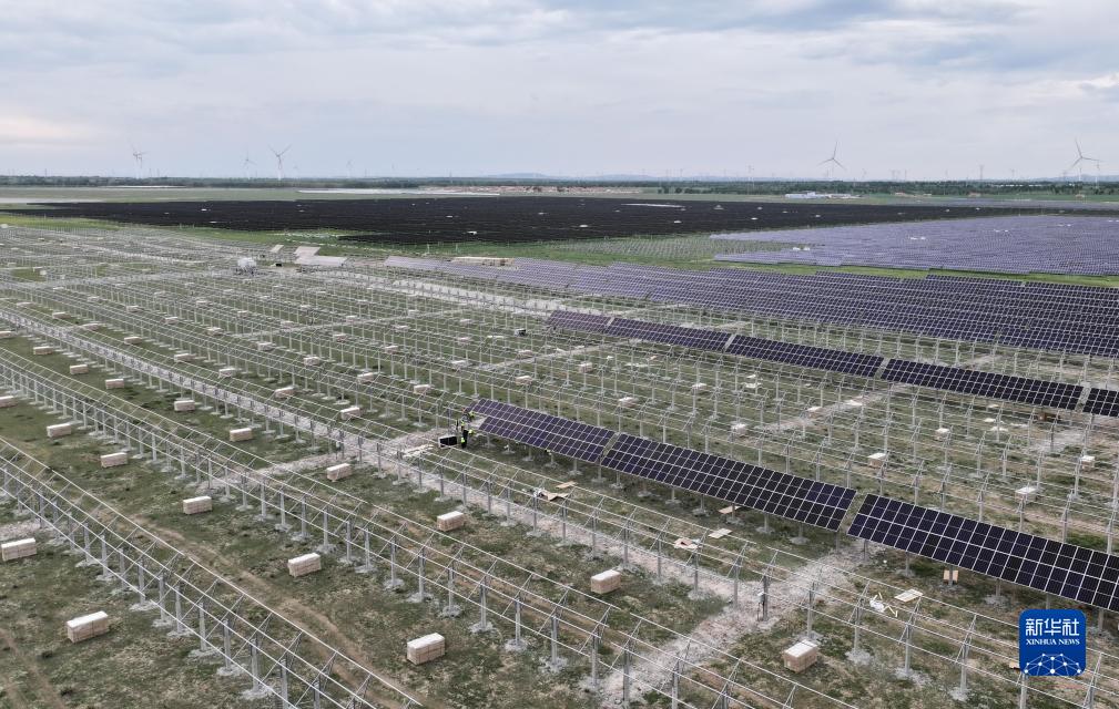 這是張家口市康??h張紀鎮一處施工中的光伏發(fā)電場(chǎng)(7月11日攝,無(wú)人機照片)。