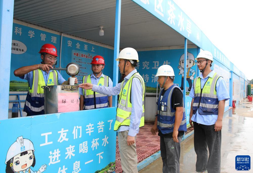 7月12日,中建二局合肥肥西產(chǎn)城融合安置點(diǎn)二期項目部工人在工地休息區茶水亭領(lǐng)取綠豆湯。