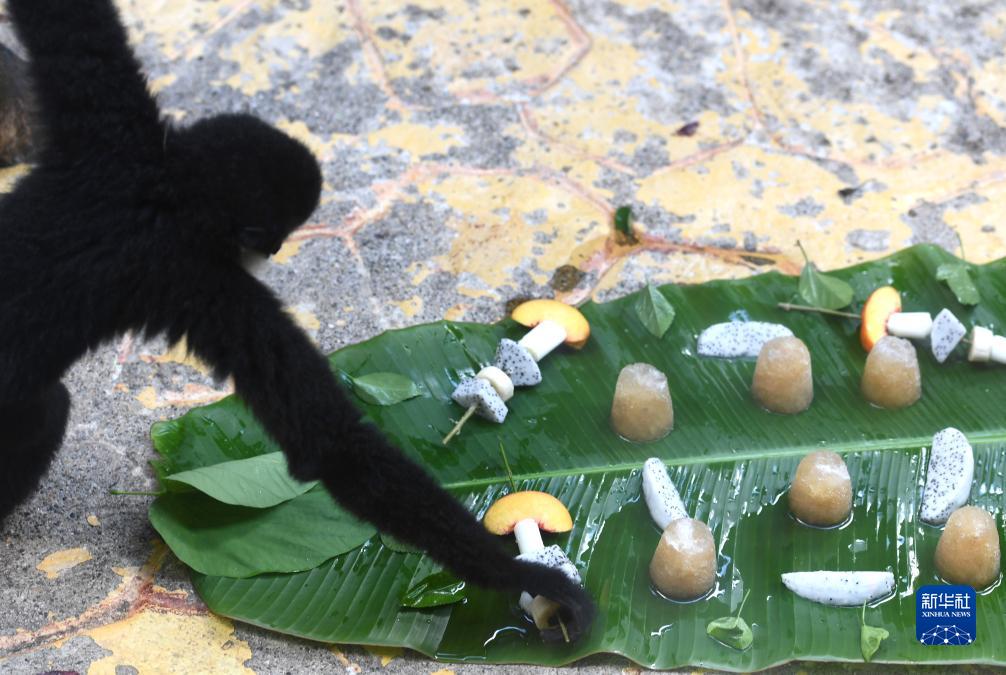 7月13日,一只長(cháng)臂猿在廣西南寧市動(dòng)物園挑選冰鎮水果。