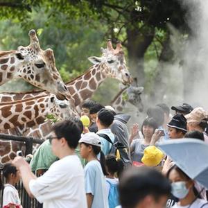7月13日,廣州動(dòng)物園采用降溫噴霧給長(cháng)頸鹿避暑。