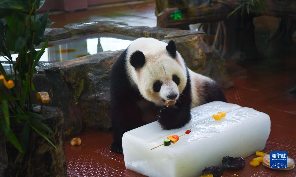 7月13日,廣州動(dòng)物園里的熊貓雅一享用冰鎮水果。