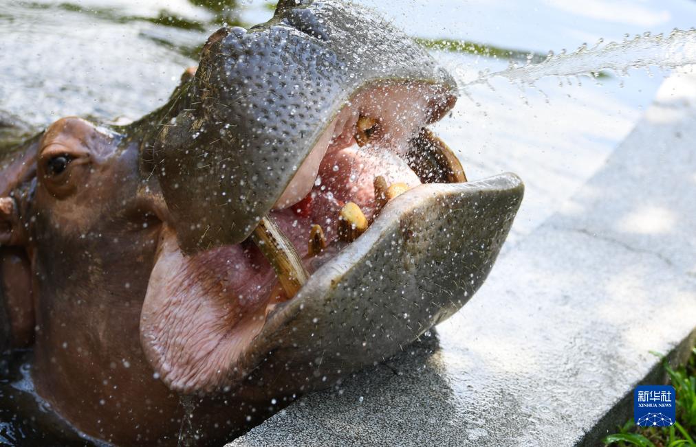 7月13日,廣州動(dòng)物園飼養員給河馬噴淋降溫。