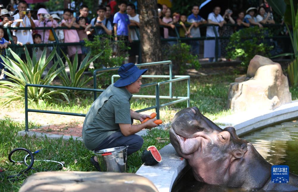 7月13日,廣州動(dòng)物園飼養員給河馬投喂胡蘿卜和西瓜。