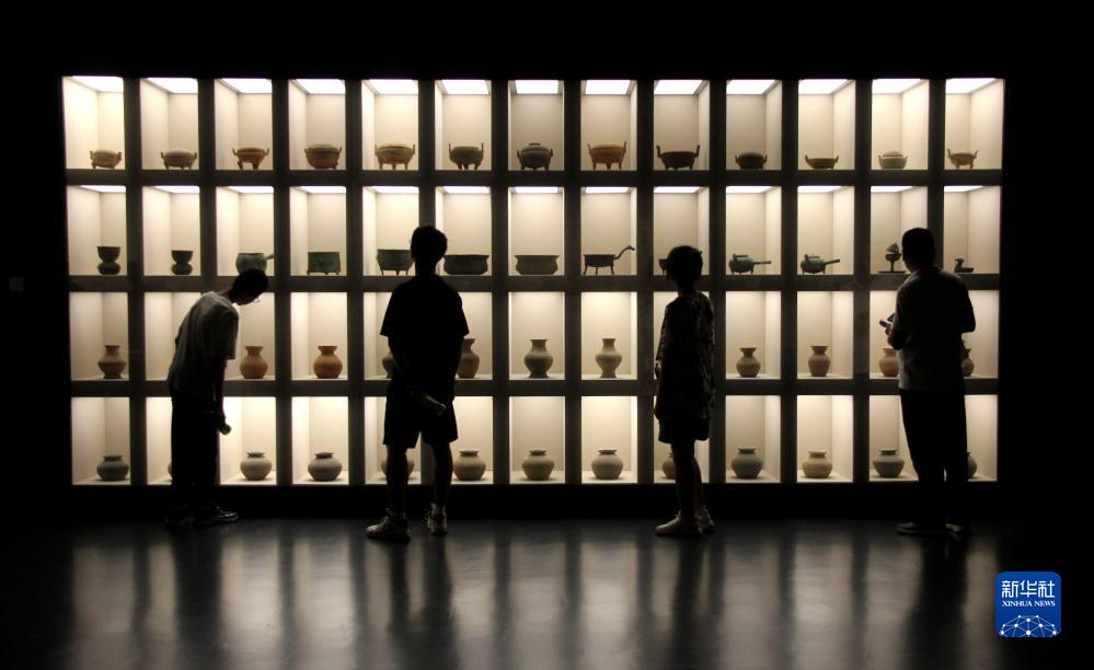 7月13日,在山東省滕州市博物館,幾名學(xué)生(左一至三)在觀(guān)看出土的文物。