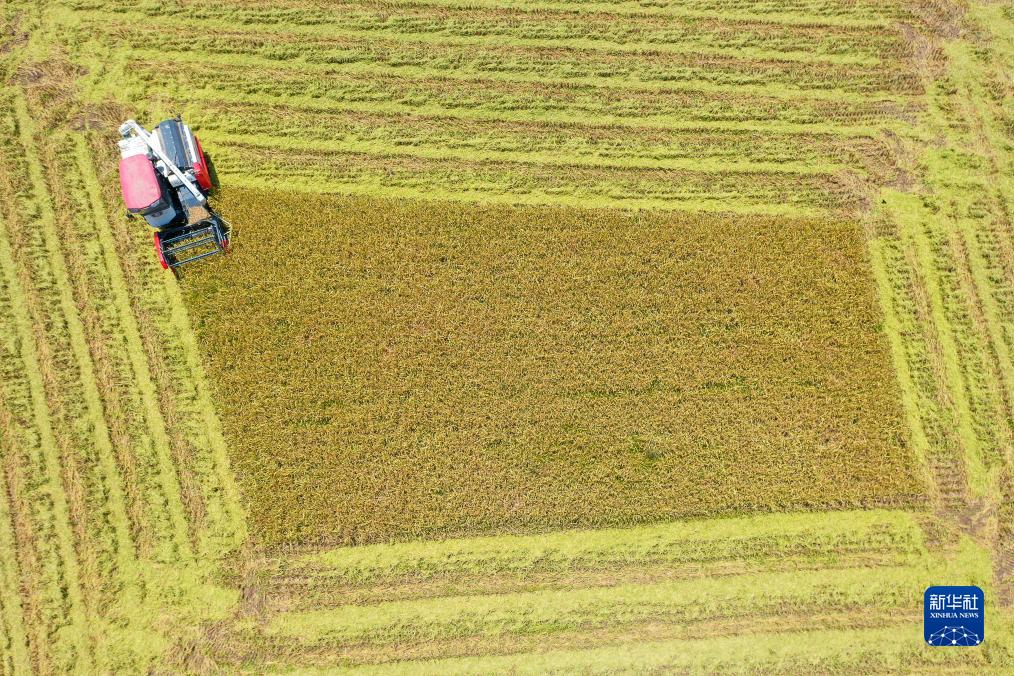 7月13日,在衡陽(yáng)市衡陽(yáng)縣臺源鎮臺九村,村民駕駛農機在田間收割早稻(無(wú)人機照片)。
