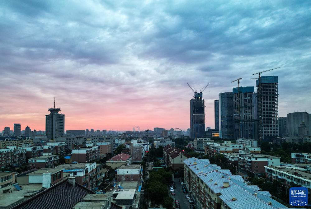 7月13日無(wú)人機拍攝的晨曦中的長(cháng)春市區。