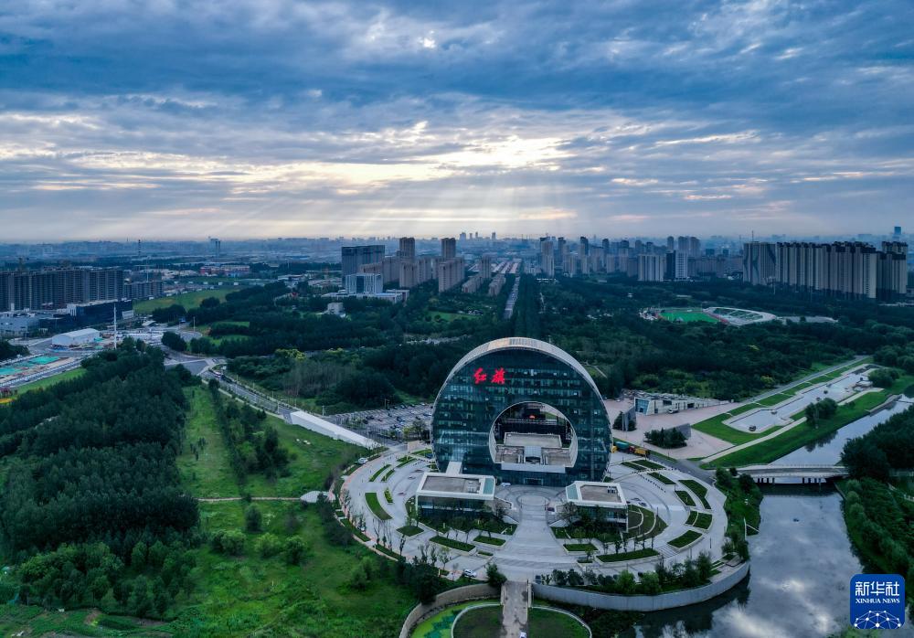 無(wú)人機拍攝的晨曦中的一汽紅旗創(chuàng )新大廈(7月13日攝)。