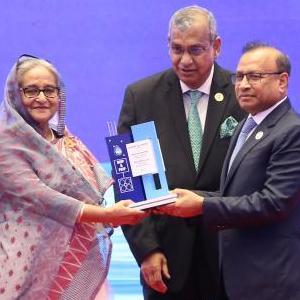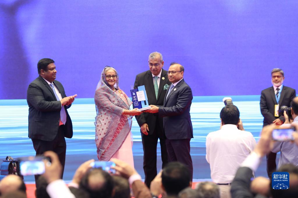 7月13日,孟加拉國總理哈西娜(左二)與孟加拉國地方政府、農村發(fā)展和合作社部部長(cháng)塔茲(左四)等在達卡出席竣工典禮。