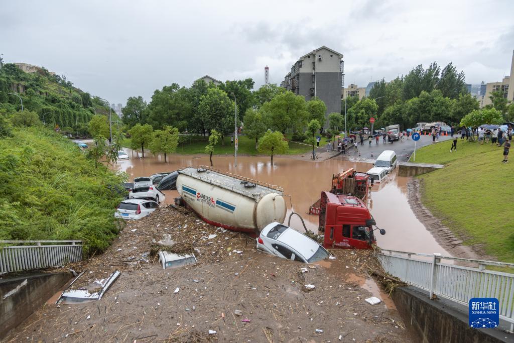 7月14日,在重慶市萬(wàn)州區江南新區,??吭诼愤叺牟糠周?chē)輛陷在洪水淤泥里。
