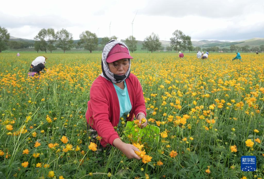 7月14日,河北省沽源縣長(cháng)梁鄉興隆堡村金蓮花種植合作社的社員在田間采摘金蓮花。