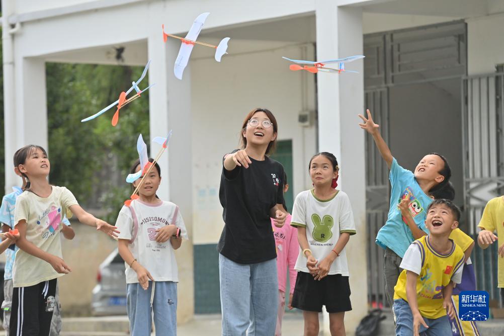 7月14日,在三江侗族自治縣知了小學(xué),南通大學(xué)學(xué)生帶著(zhù)孩子們“放飛夢(mèng)想”。