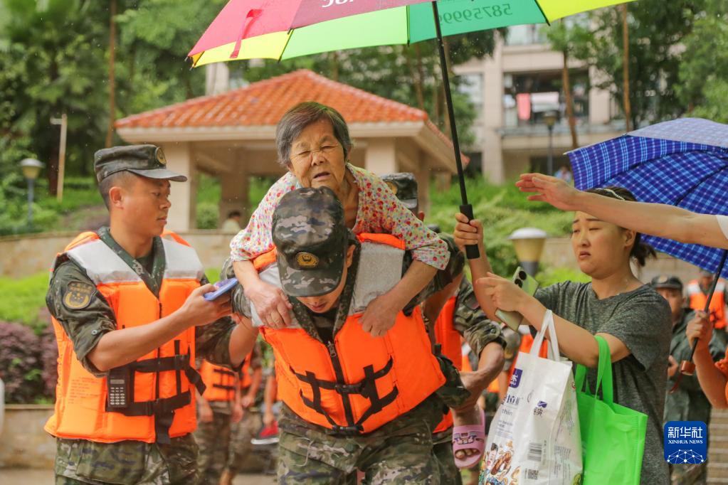 7月14日,在重慶市萬(wàn)州區江南新區,武警重慶總隊執勤第三支隊官兵在轉移群眾。
