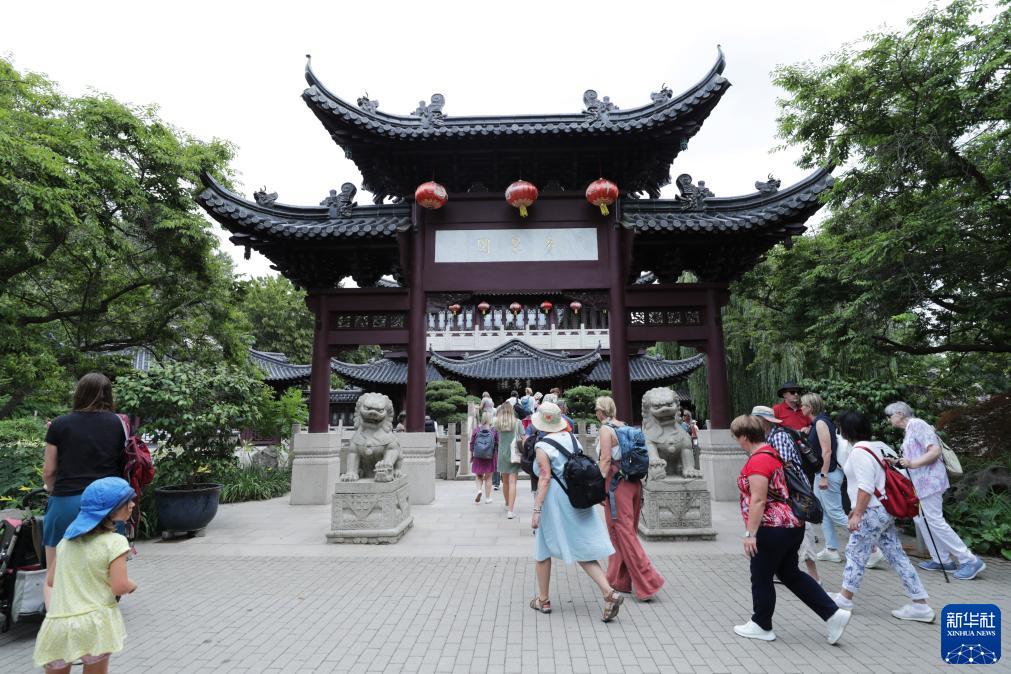 7月14日,游客在德國曼海姆的路易森公園內參觀(guān)中國園林“多景園”。