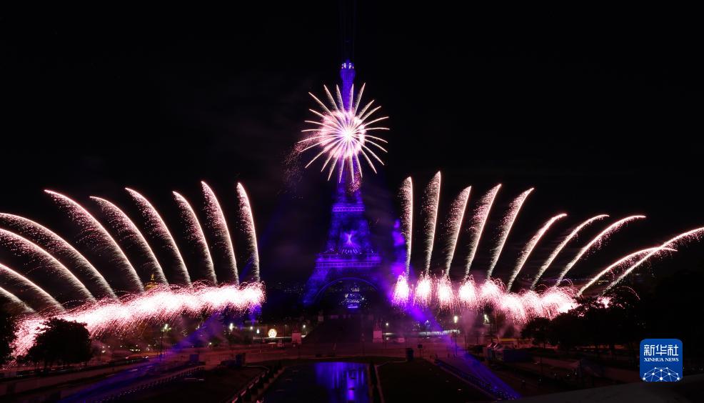 7月14日,焰火在法國巴黎埃菲爾鐵塔周?chē)`放。
