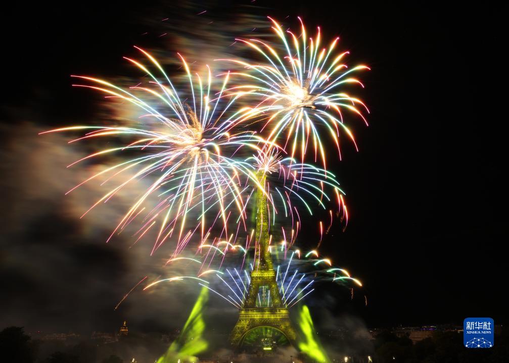 7月14日,焰火在法國巴黎埃菲爾鐵塔周?chē)`放。