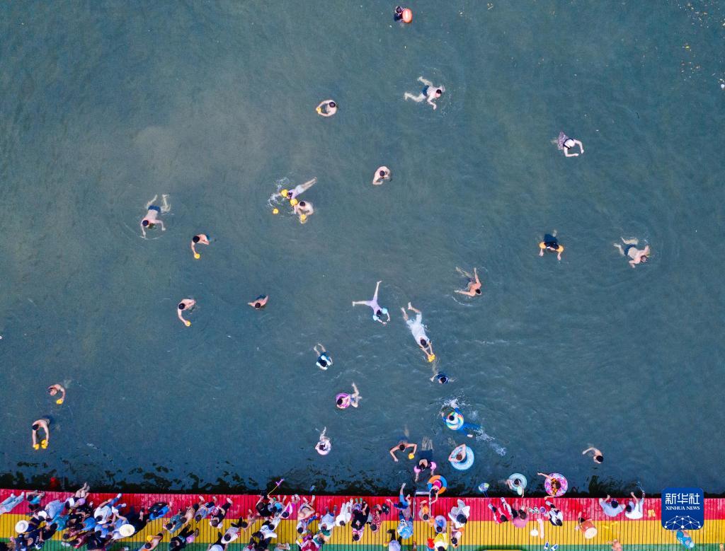 7月14日,游客和村民在乾潭鎮下包村胥溪天然泳場(chǎng)戲水,感受夏日清涼(無(wú)人機照片)。