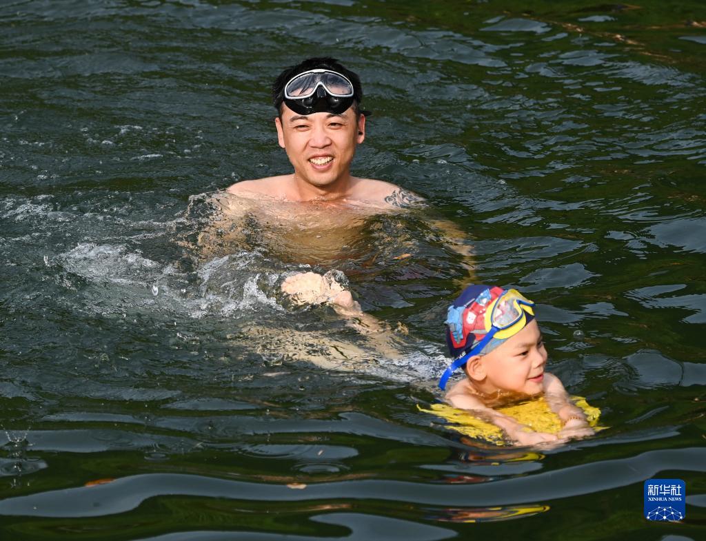 7月14日,游客和村民在乾潭鎮下包村胥溪天然泳場(chǎng)戲水,感受夏日清涼。