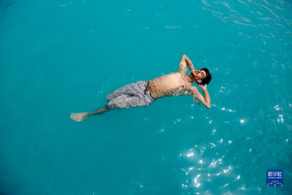 7月9日,一名男子在也門(mén)薩那一處泳池里消暑。