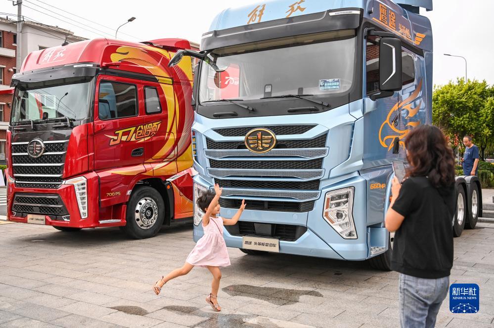 7月15日,在位于吉林長(cháng)春的紅旗會(huì )堂前,市民與展出的解放車(chē)合影留念。
