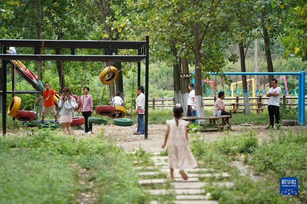 7月14日,在周至縣駱峪鎮駱峪村一處兒童游樂(lè )設施內,小朋友在家長(cháng)的陪同下玩耍。