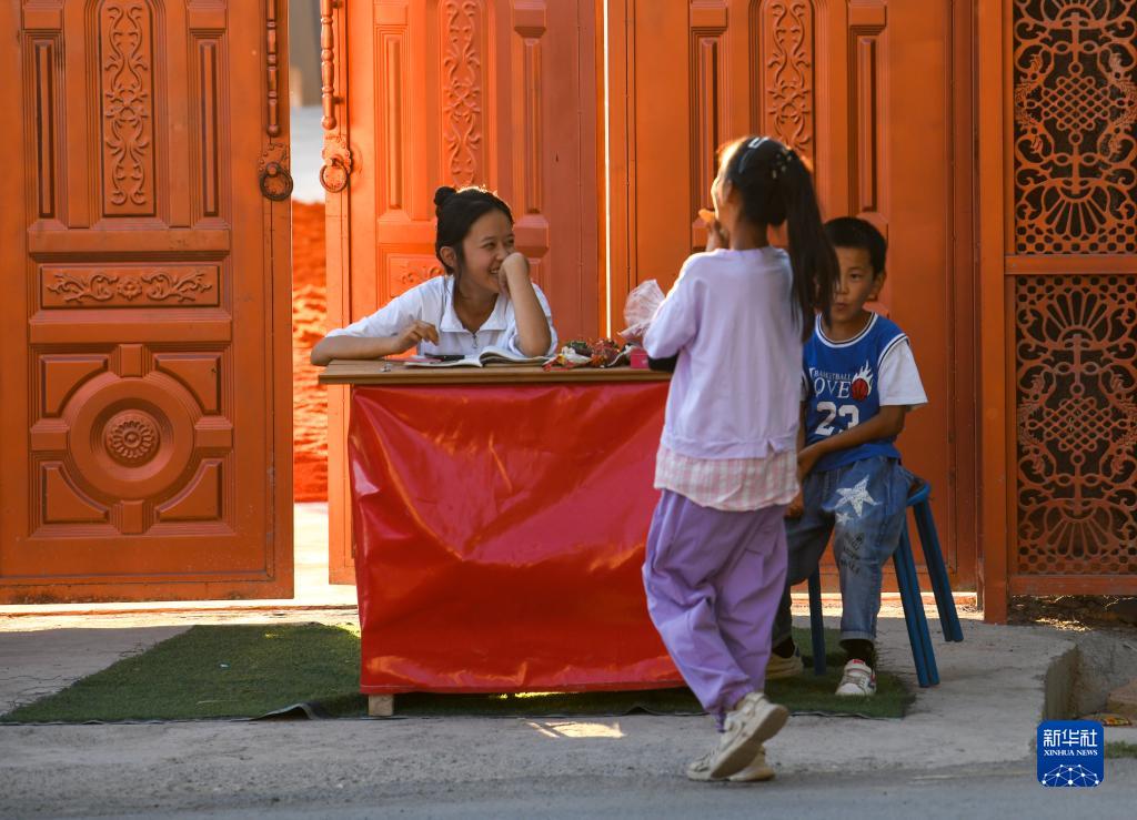 幾名小朋友在霍城縣蘆草溝鎮四宮村巷子里玩耍(7月13日攝)。
