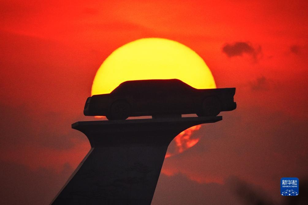 吉林省長(cháng)春市汽車(chē)廣場(chǎng)內的汽車(chē)雕塑沐浴在晨曦中(6月17日攝)。