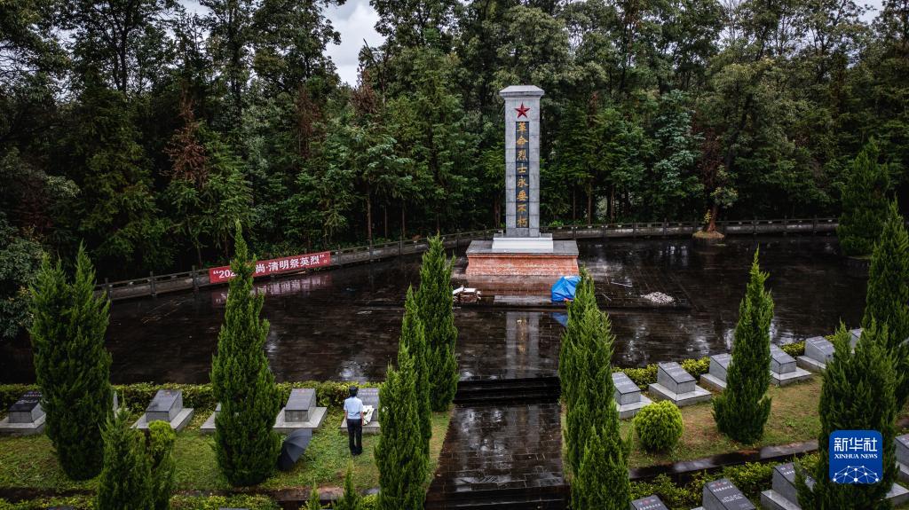 7月12日,尹銘燕在隴川縣烈士陵園祭奠犧牲的哥哥尹銘志(無(wú)人機照片)。