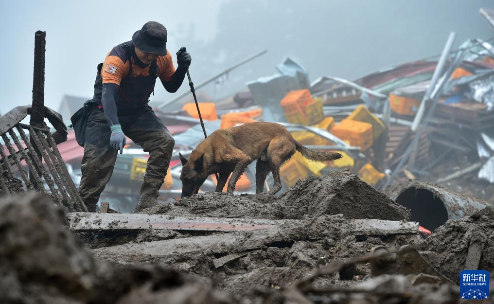 7月16日,在韓國慶尚北道醴泉郡,救援人員在因暴雨引發(fā)山體滑坡的村莊內搜救。