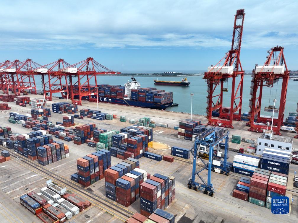 7月16日,貨輪在江蘇連云港港集裝箱碼頭泊位上裝卸集裝箱(無(wú)人機照片)。