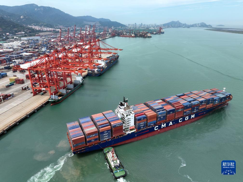 7月16日,在江蘇連云港港集裝箱碼頭,貨輪滿(mǎn)載集裝箱駛離泊位(無(wú)人機照片)。