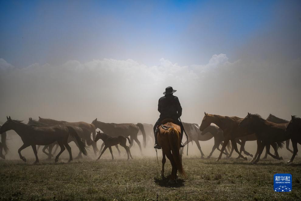 7月16日,牧民在昭蘇縣天馬旅游文化園的草原上遛馬。
