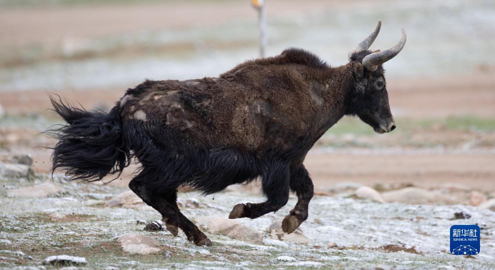7月2日,在新疆阿爾金山國家級自然保護區,一只野牦牛在雪地上奔跑。
