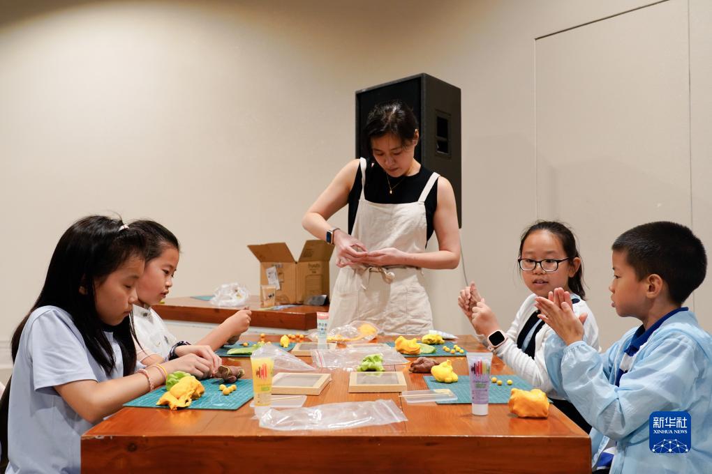 7月16日晚,小朋友在世博會(huì )博物館制作向日葵粘土相框。