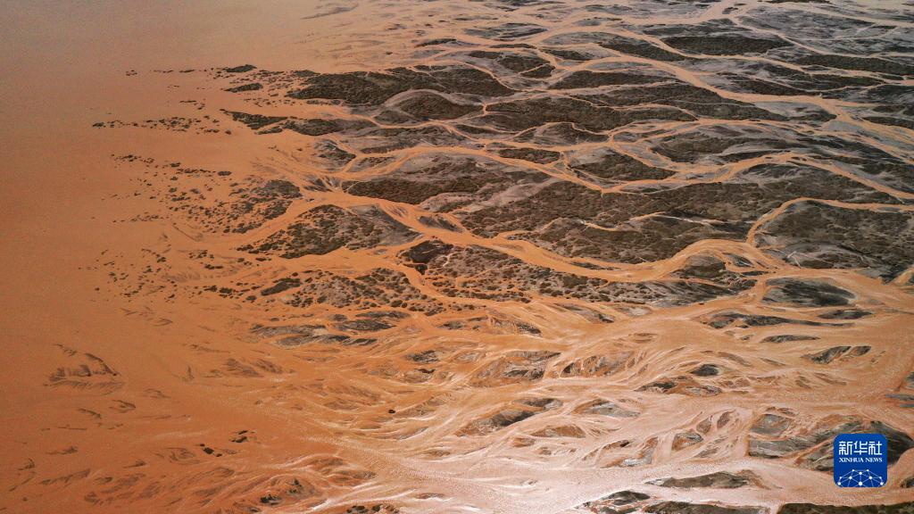 7月10日在新疆阿爾金山國家級自然保護區阿其克湖邊拍攝的洪水沖刷下的河谷(無(wú)人機照片)。