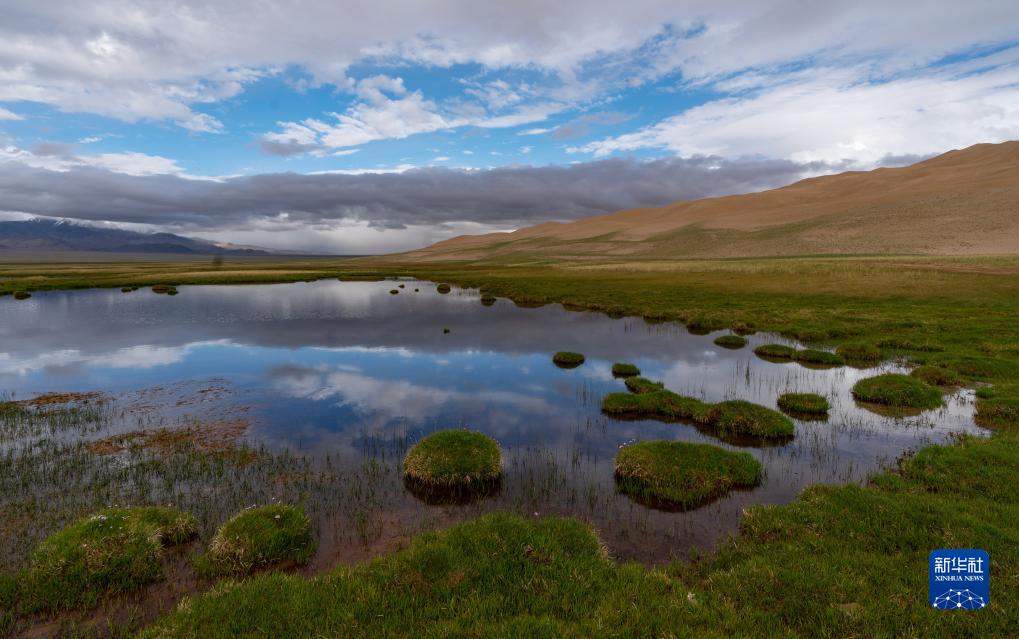 7月1日,在新疆阿爾金山國家自然保護區,庫木庫里沙漠旁的一處濕地水面倒映出天空。