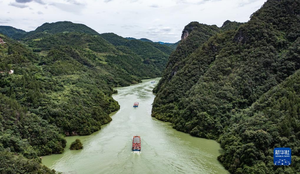 集裝箱貨輪從貴州省遵義市余慶縣沙灣碼頭駛出,前往重慶涪陵黃旗港(7月14日攝,無(wú)人機照片)。