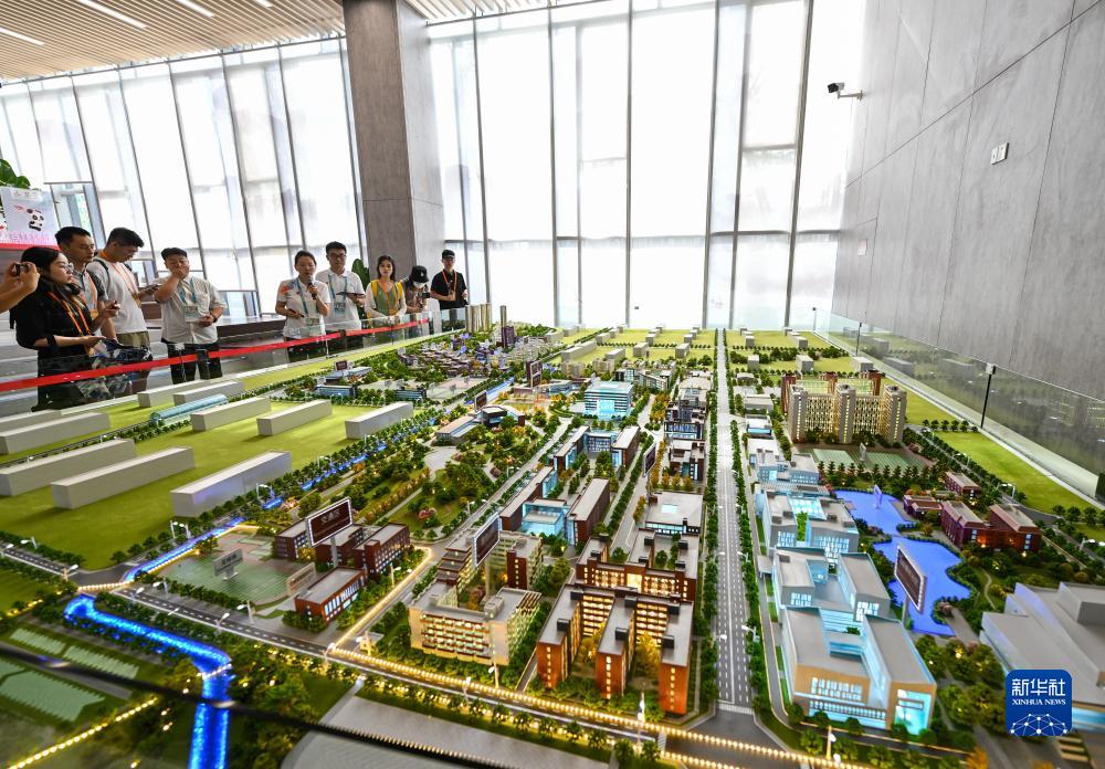 7月15日,媒體記者在大運村歡迎中心觀(guān)看園區沙盤(pán)。