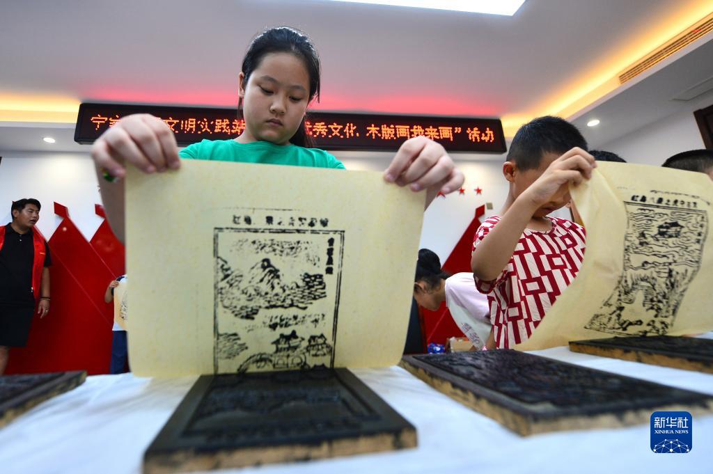7月17日,在山東省青島市城陽(yáng)區紅島街道寧家社區公益課堂,學(xué)生們體驗制作木版年畫(huà)“紅島八景”。