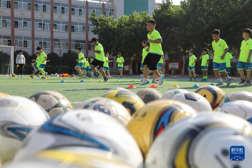 7月17日,在河南省平頂山市寶豐縣山河路小學(xué),孩子們在球場(chǎng)上訓練。