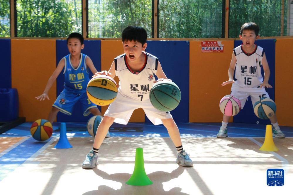 7月17日,在山東省高密市一籃球訓練營(yíng),孩子們在進(jìn)行籃球基本功訓練。