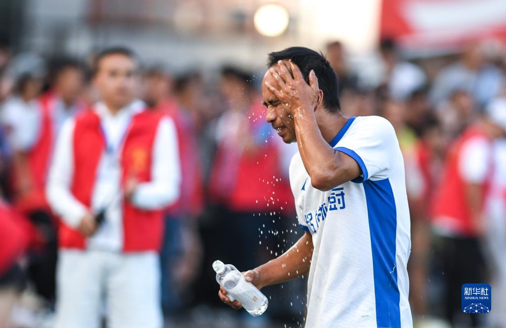 7月15日,豐樂(lè )村一隊球員朱永輝在“村超”賽場(chǎng)上補水降溫。