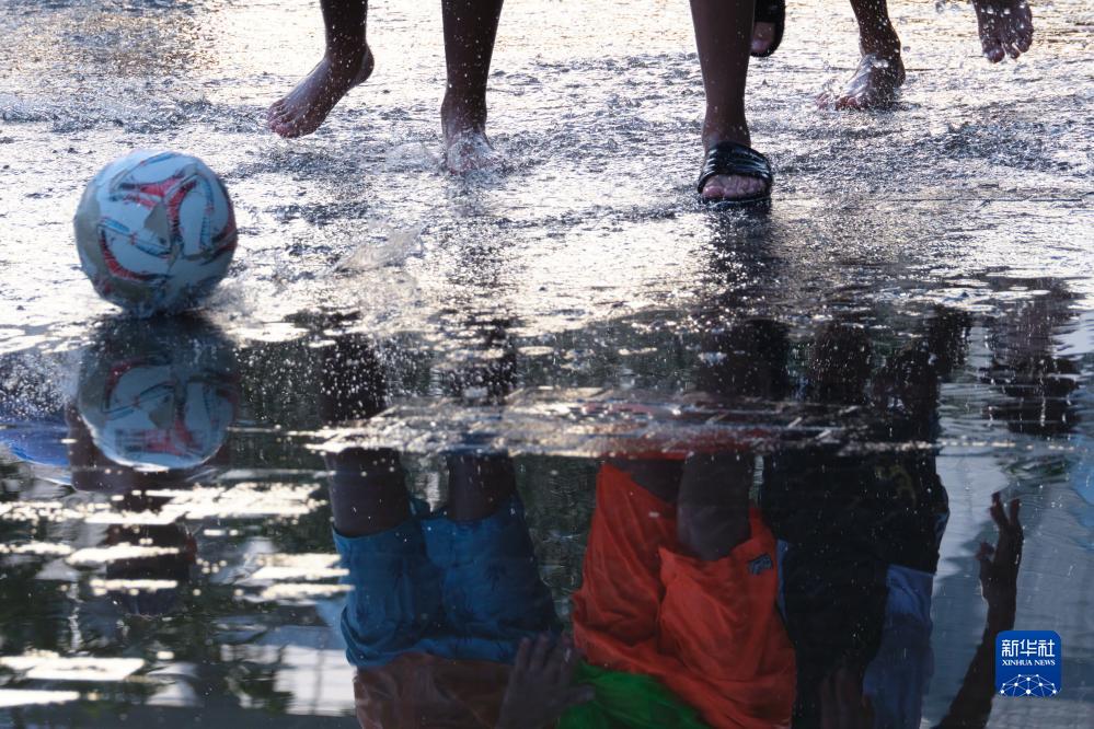 7月17日,孩子們在西班牙馬德里的噴泉中踢球。