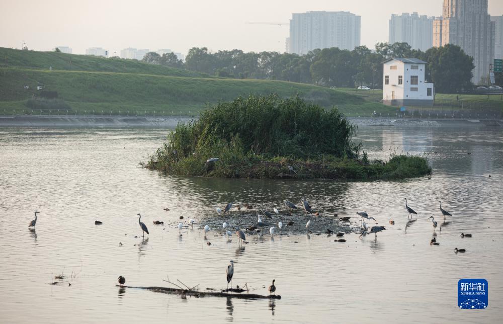在成都市錦江高新區段,眾多水鳥(niǎo)棲息在生態(tài)鳥(niǎo)島上(7月18日攝)。