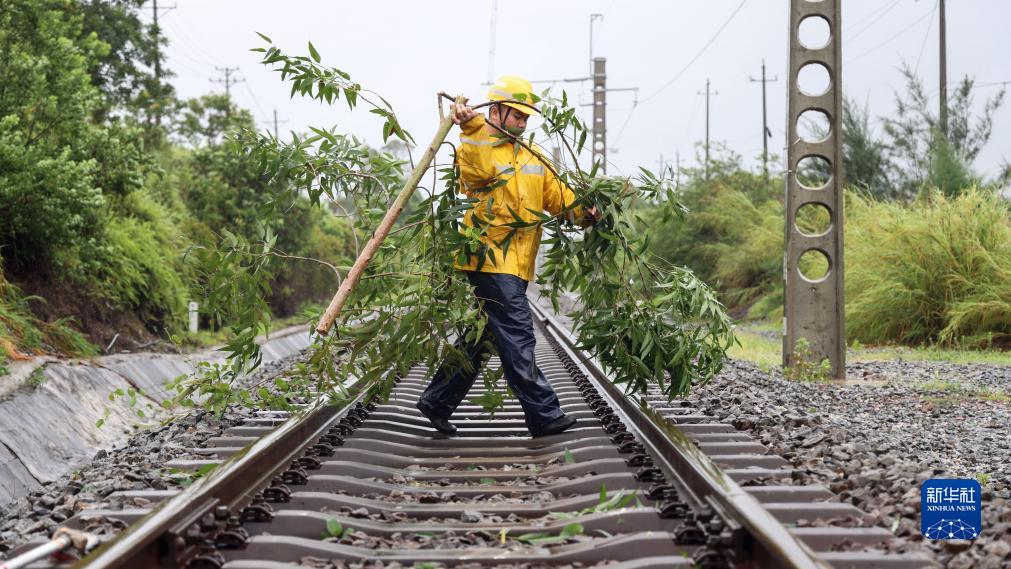 7月18日,國鐵南寧局沿海鐵路公司職工在清理軌道上的樹(shù)枝。當日,國鐵南寧局沿海鐵路公司組織職工利用軌道車(chē),在風(fēng)雨中對西部陸海新通道鐵路沿線(xiàn)進(jìn)行巡檢,對線(xiàn)路和防洪重點(diǎn)處所進(jìn)行全面巡查,及時(shí)處理危竹危樹(shù)、接觸網(wǎng)設備隱患等問(wèn)題,全力確保鐵路運行安全。