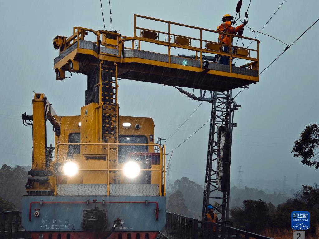7月18日,國鐵南寧局沿海鐵路公司職工在排查接觸網(wǎng)。當日,國鐵南寧局沿海鐵路公司組織職工利用軌道車(chē),在風(fēng)雨中對西部陸海新通道鐵路沿線(xiàn)進(jìn)行巡檢,對線(xiàn)路和防洪重點(diǎn)處所進(jìn)行全面巡查,及時(shí)處理危竹危樹(shù)、接觸網(wǎng)設備隱患等問(wèn)題,全力確保鐵路運行安全。
